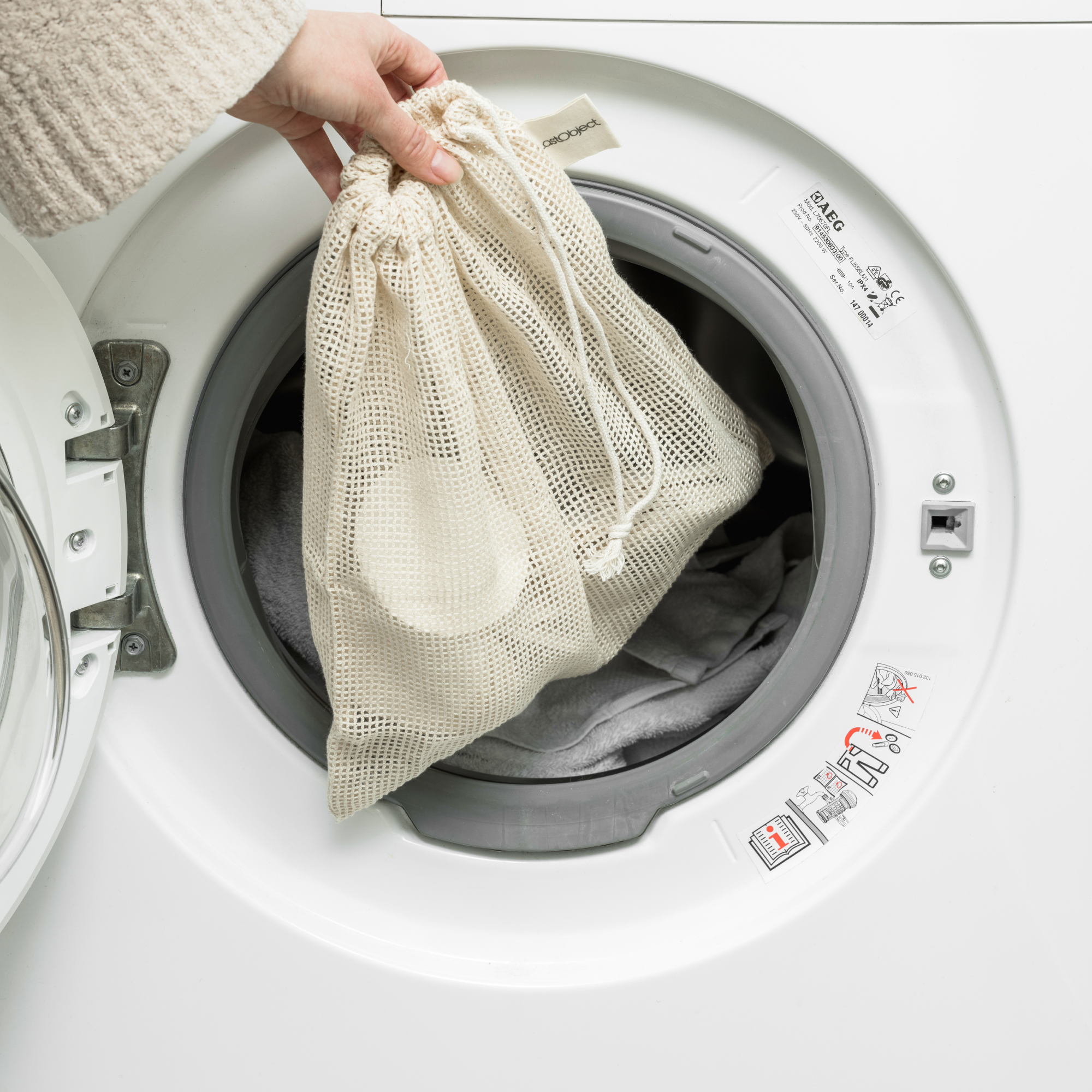 A laundry bag is a good way to protect smaller items when they need to be machine washed. They are exposed to less wear and tear and they do not disappear. Choose a bag made of cotton to reduce microplastics emitted during washing!