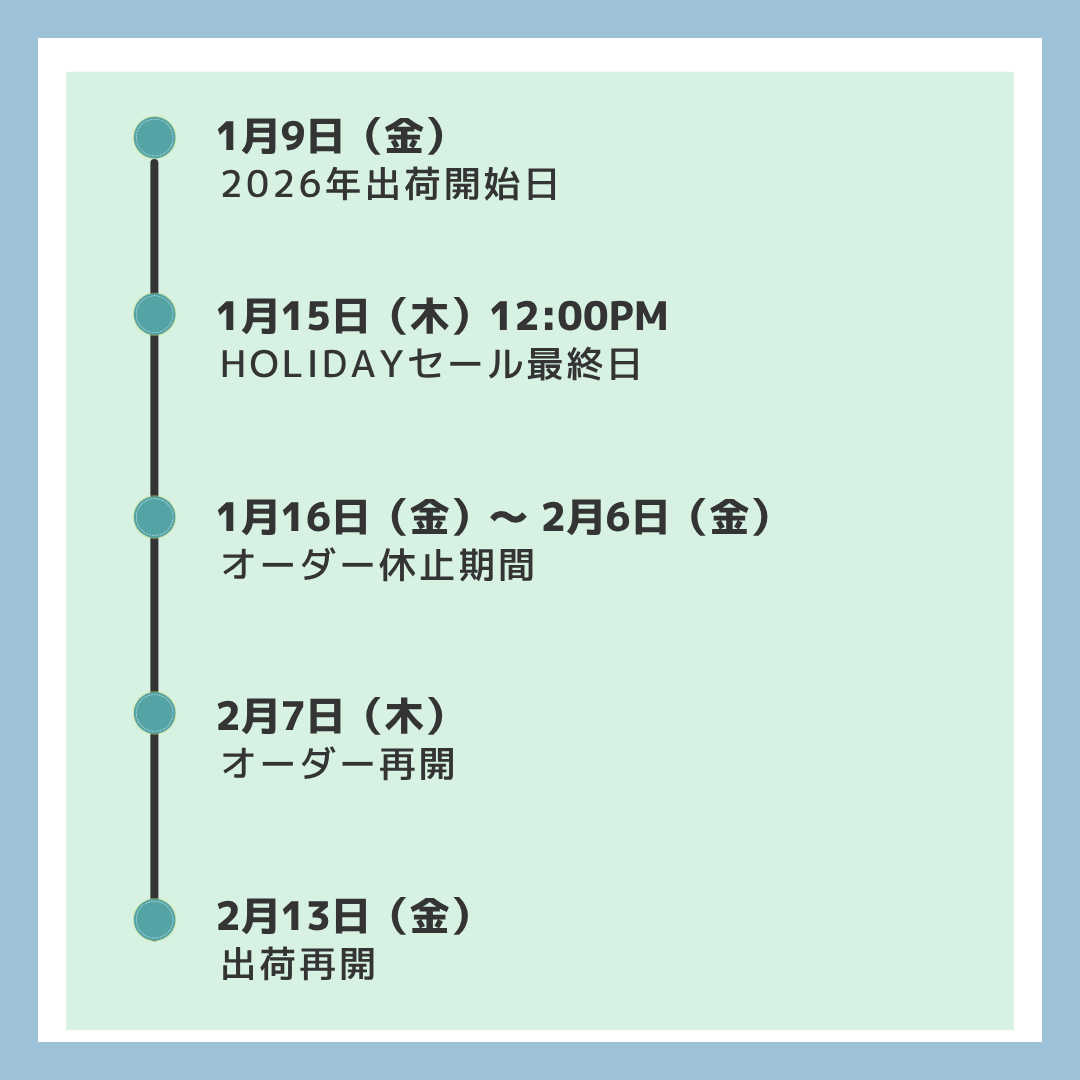 1月中旬から2月初旬まで出荷をお休みするため、今がまとめ買いのベストタイミングです!
