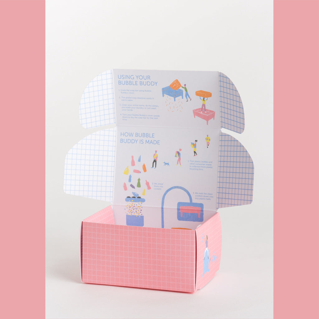 その次のアクションでできたのがバブルバディ。バブルバディは、固形石鹸の使用を促進するツールです。 石鹸をすばやく乾かすだけでなく、固形石鹸を素早く石鹸水に変えるおろし金としても使用可能。プラスチックボトルに入った液体石鹸はもう必要ありません!