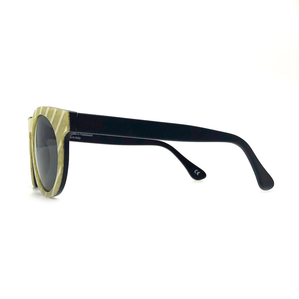 初めてこのサングラスと出会った時、すぐにでも自分の目で確かめたいと思い、サンプルでオーダーをしました。使われる箇所によってはソリッドカラーであったり、個性的な柄になったりと、同じものが何一つ存在しないのは、大きな魅力です。また、型はこれ以外にいくつかありますのが、今回はアジアンフィットを重視し、このモデルのみをオーダーしました。すべての工程をイタリアで行なっており、まさしく、その地の環境によって生まれた素晴らしいアイデアだと言えます。